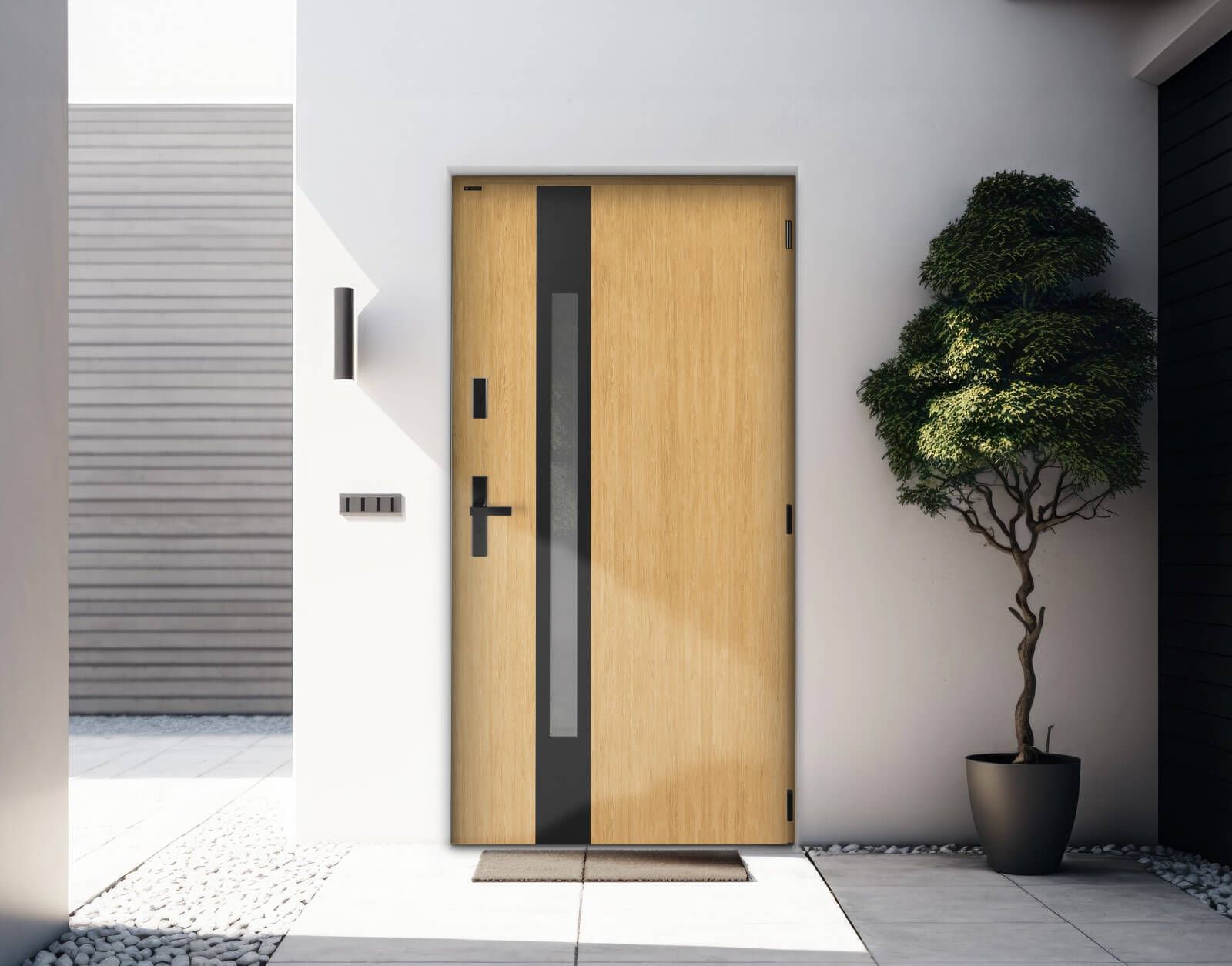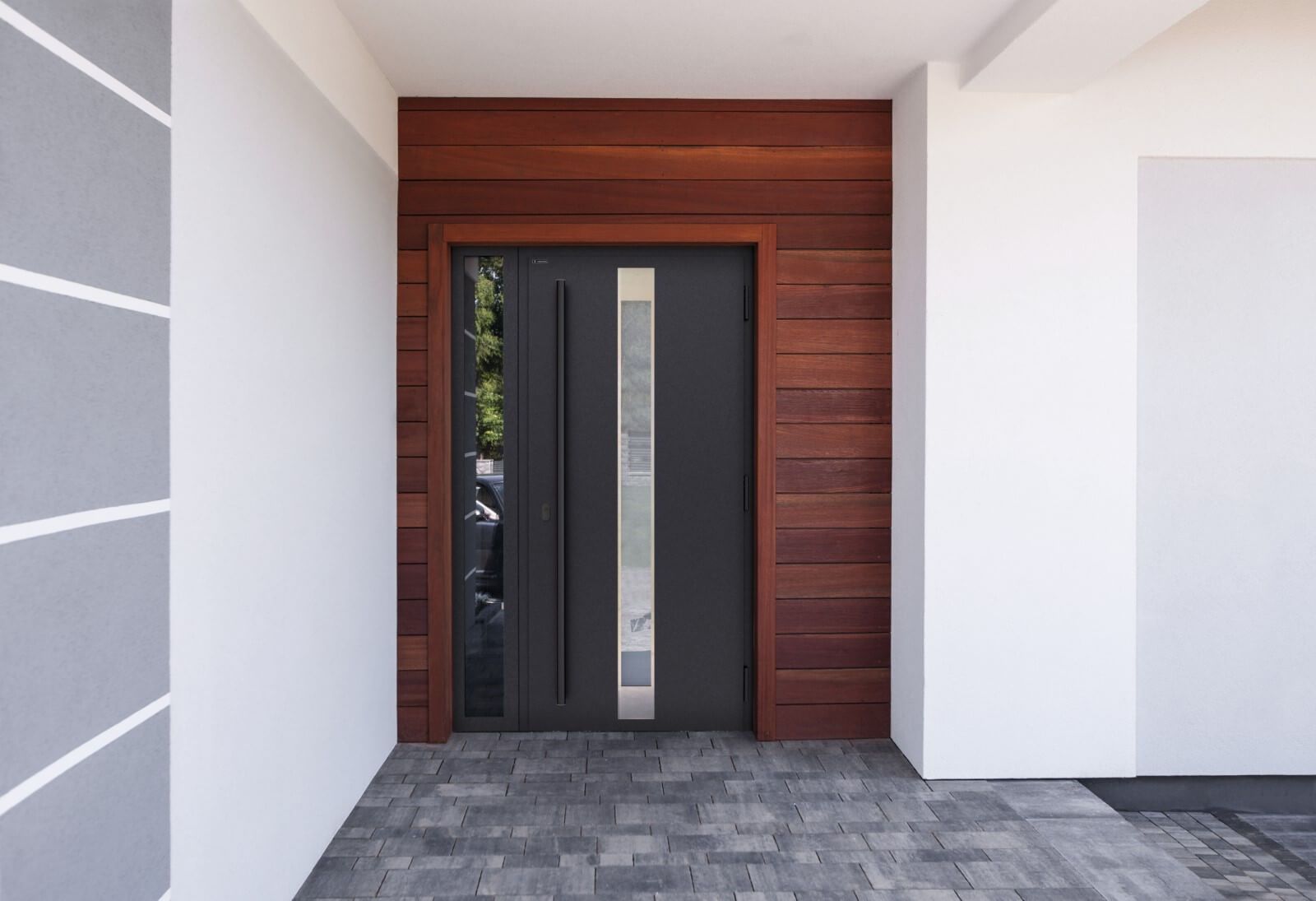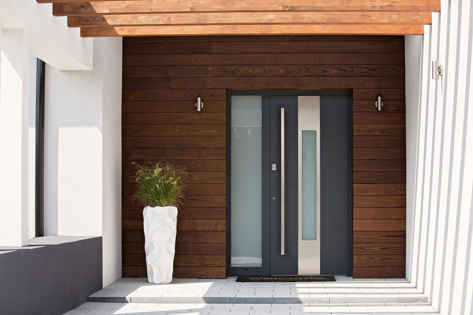 Rezygnacja z zadaszenia pozwala na zachowanie czystej, minimalistycznej linii strefy wejściowej. Drzwi marki WIŚNIOWSKI stają się integralną częścią nowoczesnej architektury, subtelnie eksponując jej prostotę oraz wyrafinowaną elegancję.