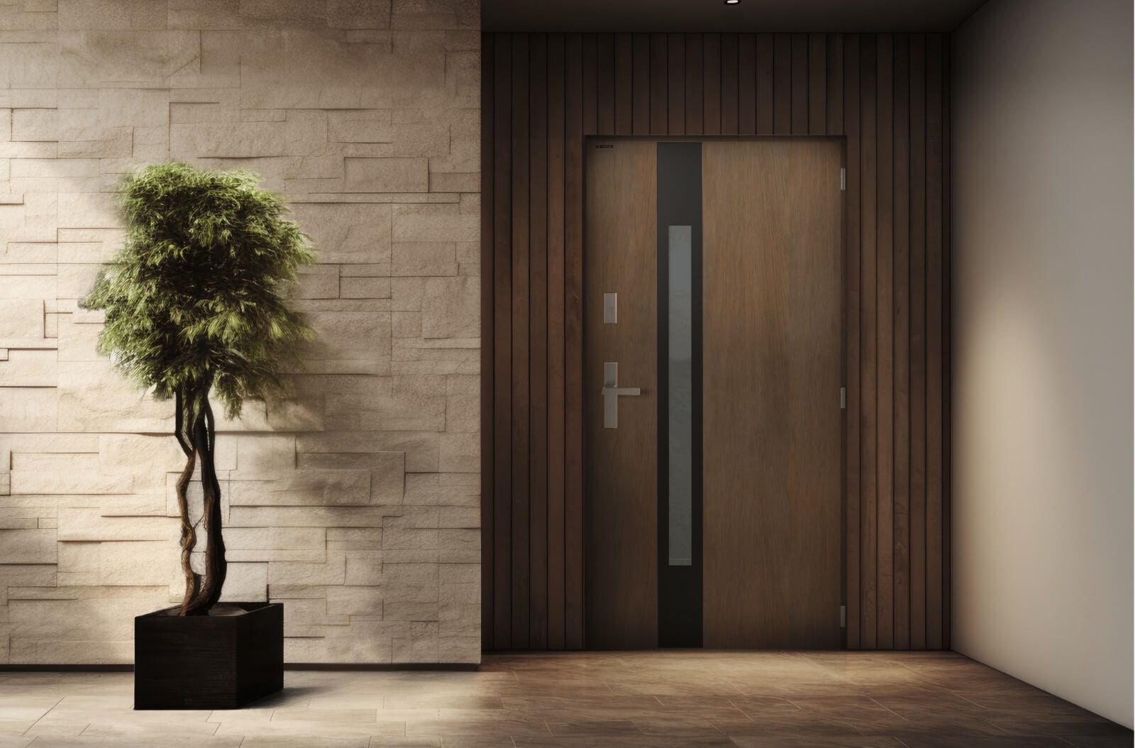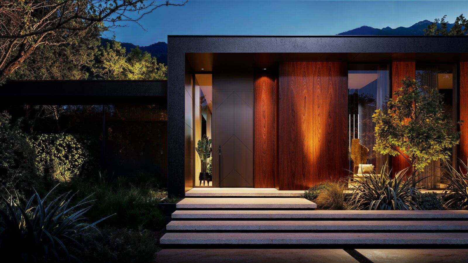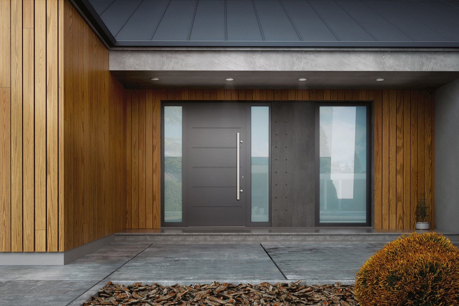 Rezygnacja z zadaszenia pozwala na zachowanie czystej, minimalistycznej linii strefy wejściowej. Drzwi marki WIŚNIOWSKI stają się integralną częścią nowoczesnej architektury, subtelnie eksponując jej prostotę oraz wyrafinowaną elegancję.