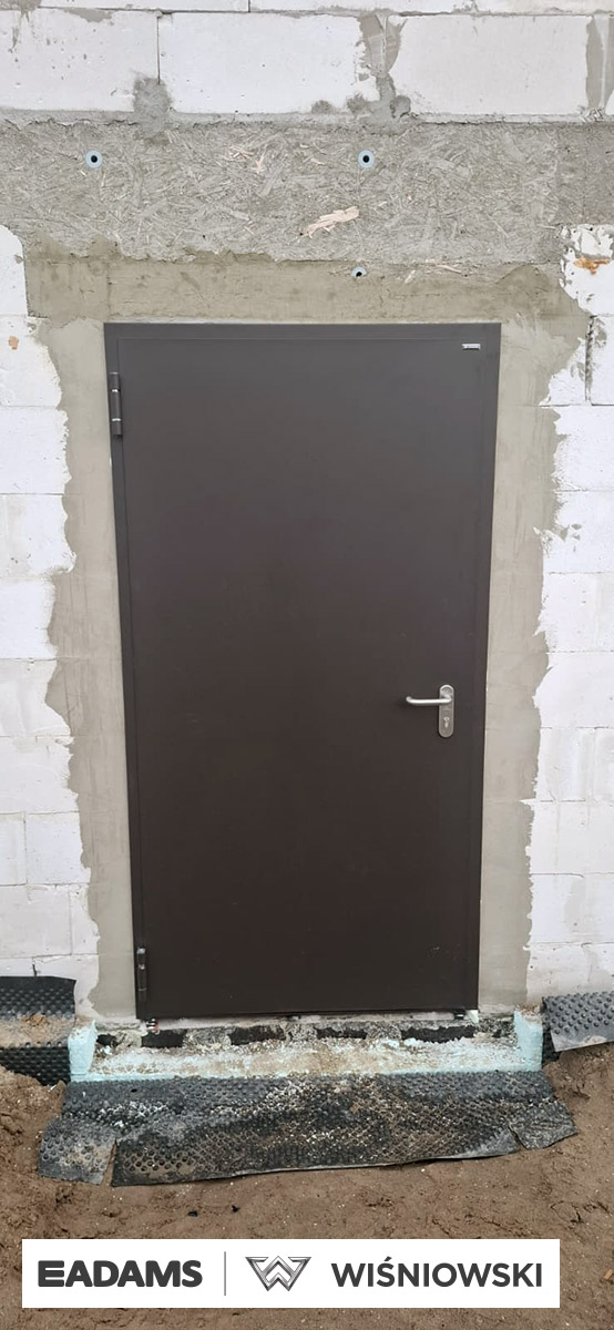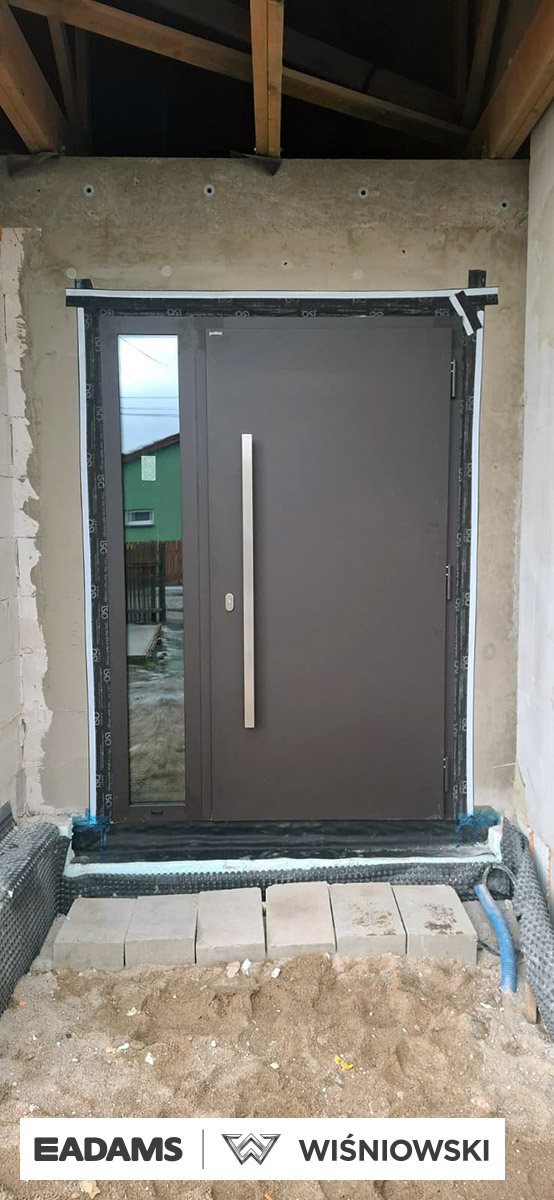 Strefa wejściowa została zaakcentowana drzwiami o podwyższonej trwałości i nowoczesnym charakterze. Wybrany model to drzwi wejściowe Nova (wzór 001) w strukturalnym kolorze RAL 8019, wyposażone w eleganckie doświetle lewe, które naturalnie rozjaśnia wnętrze przedpokoju. Jako dopełnienie inwestycji zamontowaliśmy drzwi techniczne ECO, zachowując tę samą kolorystykę, co zapewnia spójność wizualną całego budynku.