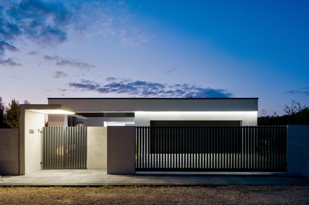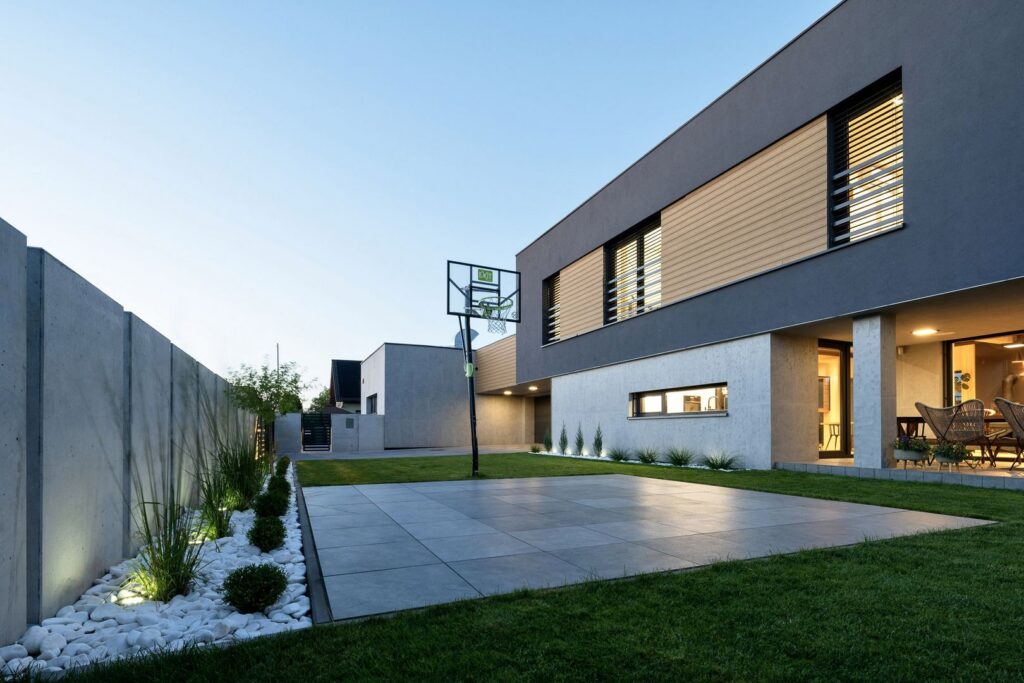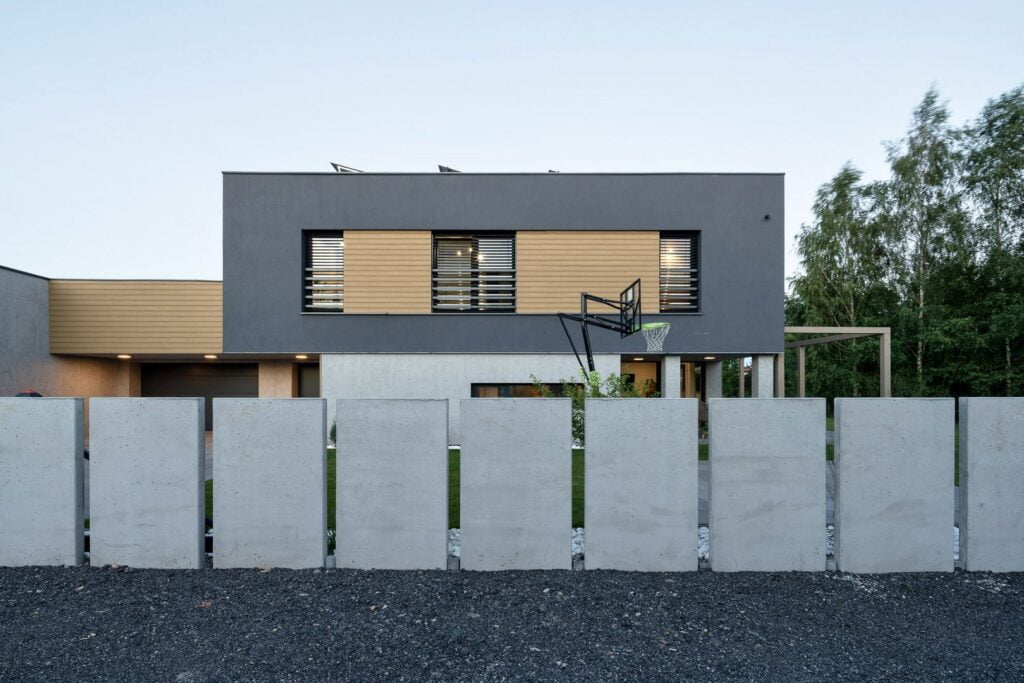 Nowoczesne ogrodzenie betonowe to rozwiązanie, w którym beton łączy się z nowoczesną stylistyką: duże gładkie panele, stonowana kolorystyka, geometryczne wzory, możliwa integracja z oświetleniem LED lub motywami dekoracyjnymi. LOVBET oferuje m.in.: panele o wzorach „Deska”, „Kamień łamany”, „Żaluzja”, panele gładkie oraz możliwość kolorowania. Dzięki temu ogrodzenie doskonale wpisuje się w architekturę modernistyczną, skandynawską czy industrialną.
